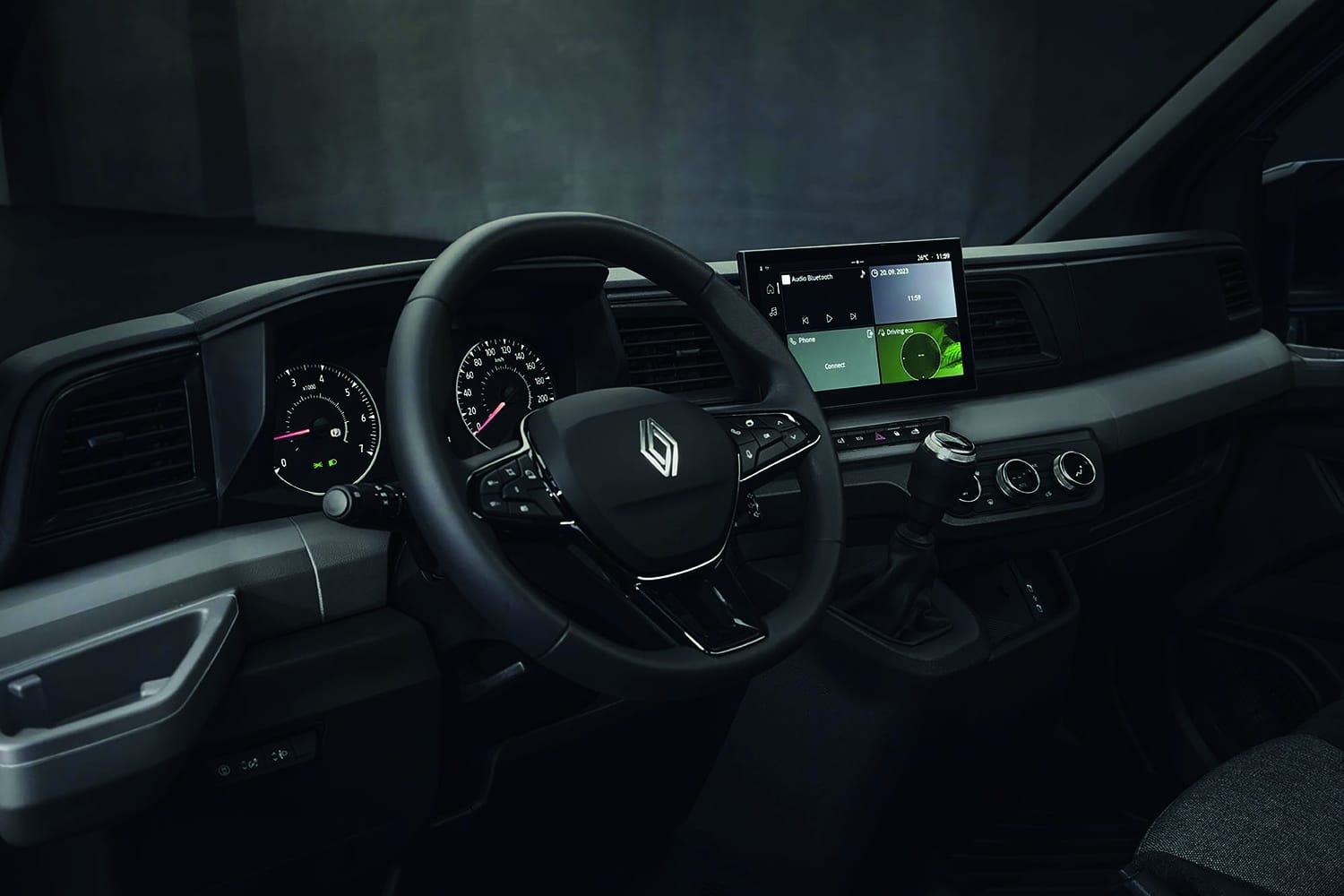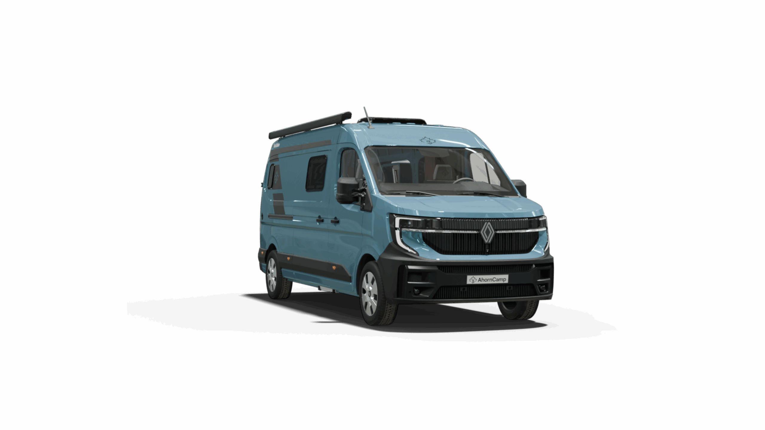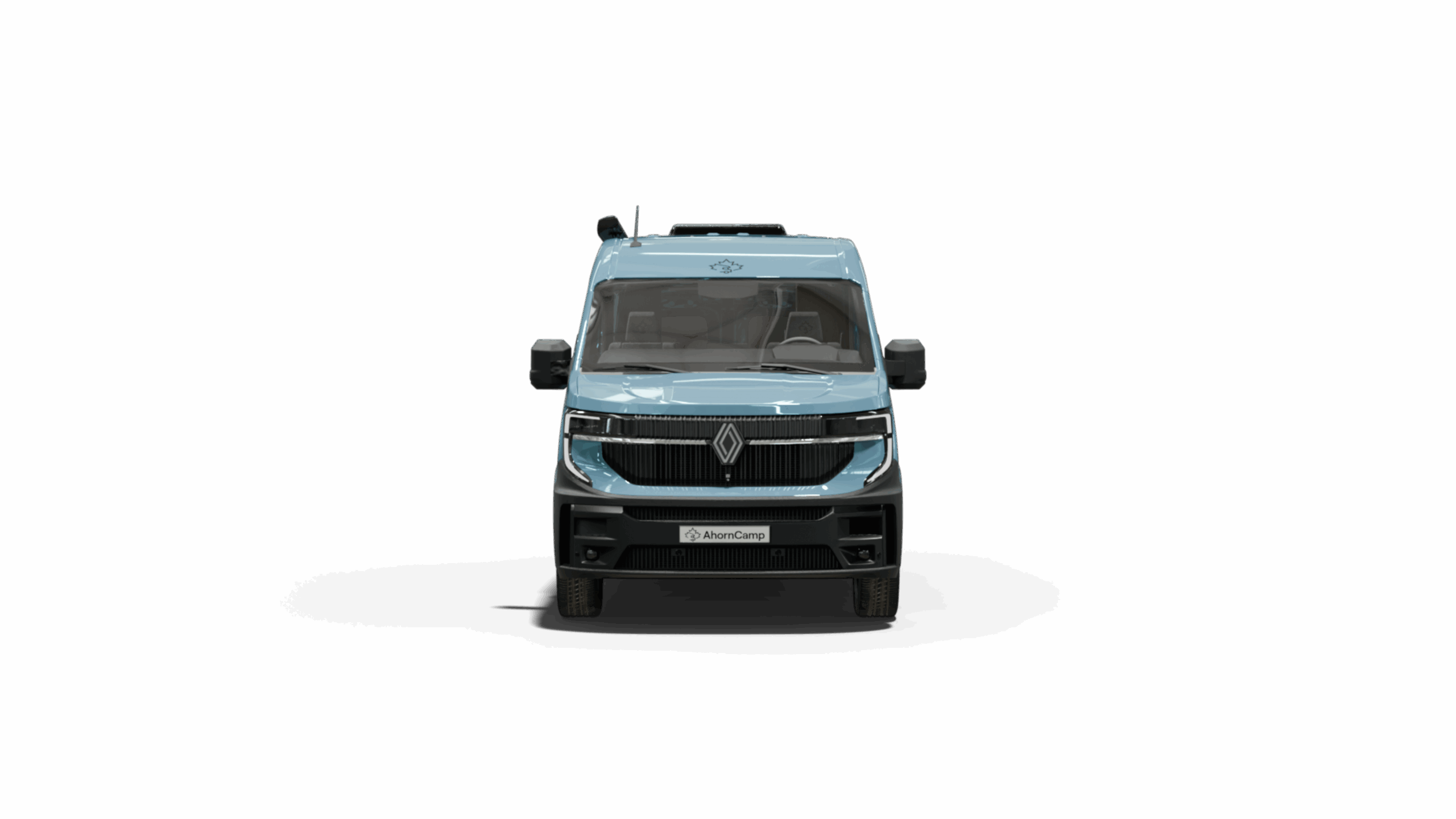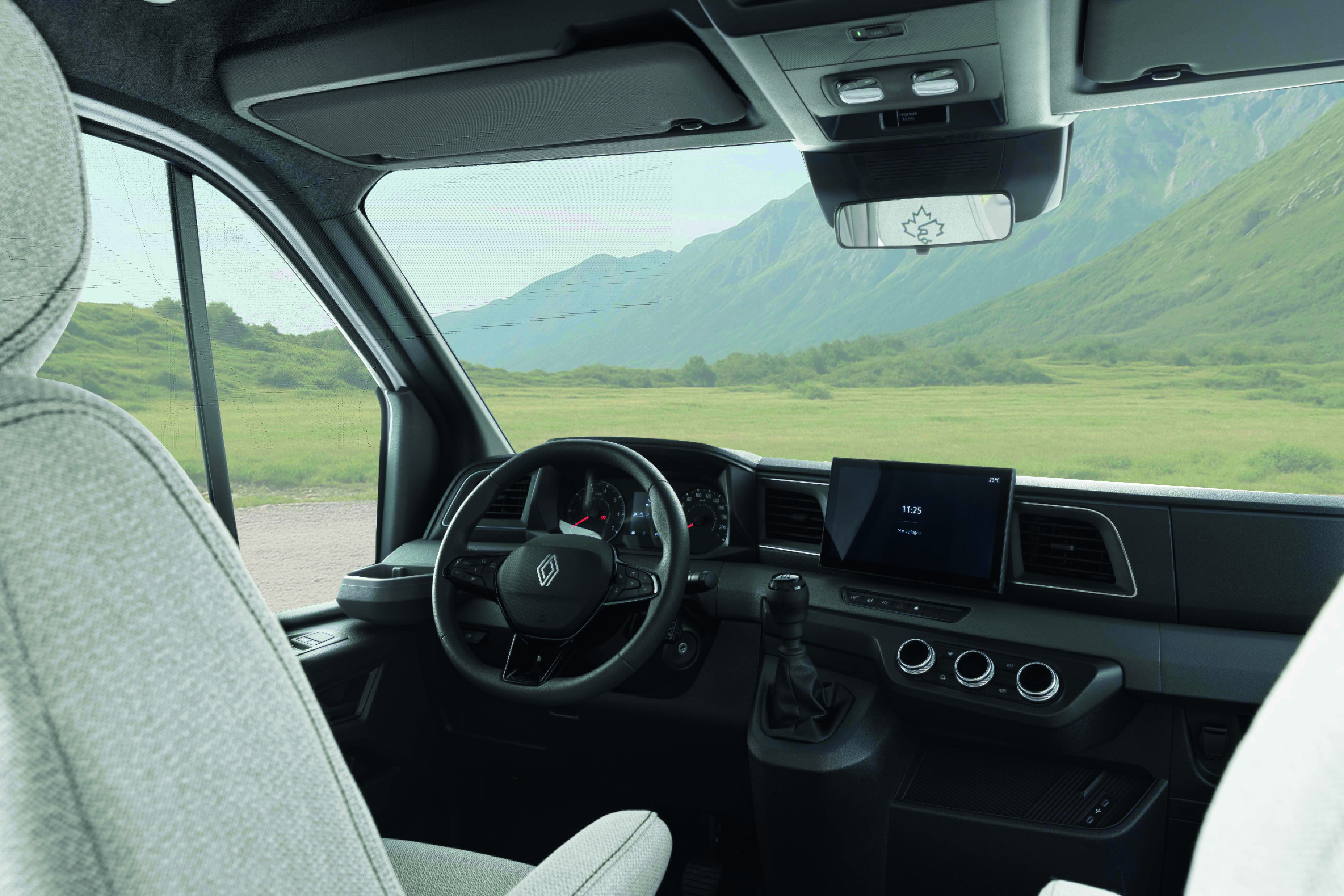 C-förmige LED-Tagfahrlichter prägen die Fahrzeugfront und rahmen den kraftvollen Kühlergrill mit dem charakteristischen neuen Renault Logo ein. Auf den Seitenflächen setzen Beklebungen in C-Form und das gestanzte Ahorn-Logo auf matter Oberfläche einen unverwechselbaren Akzent. Elemente vom Außendesign finden sich auch im Inneren wider. Der Van ist geprägt durch eine aerodynamische Linienführung.