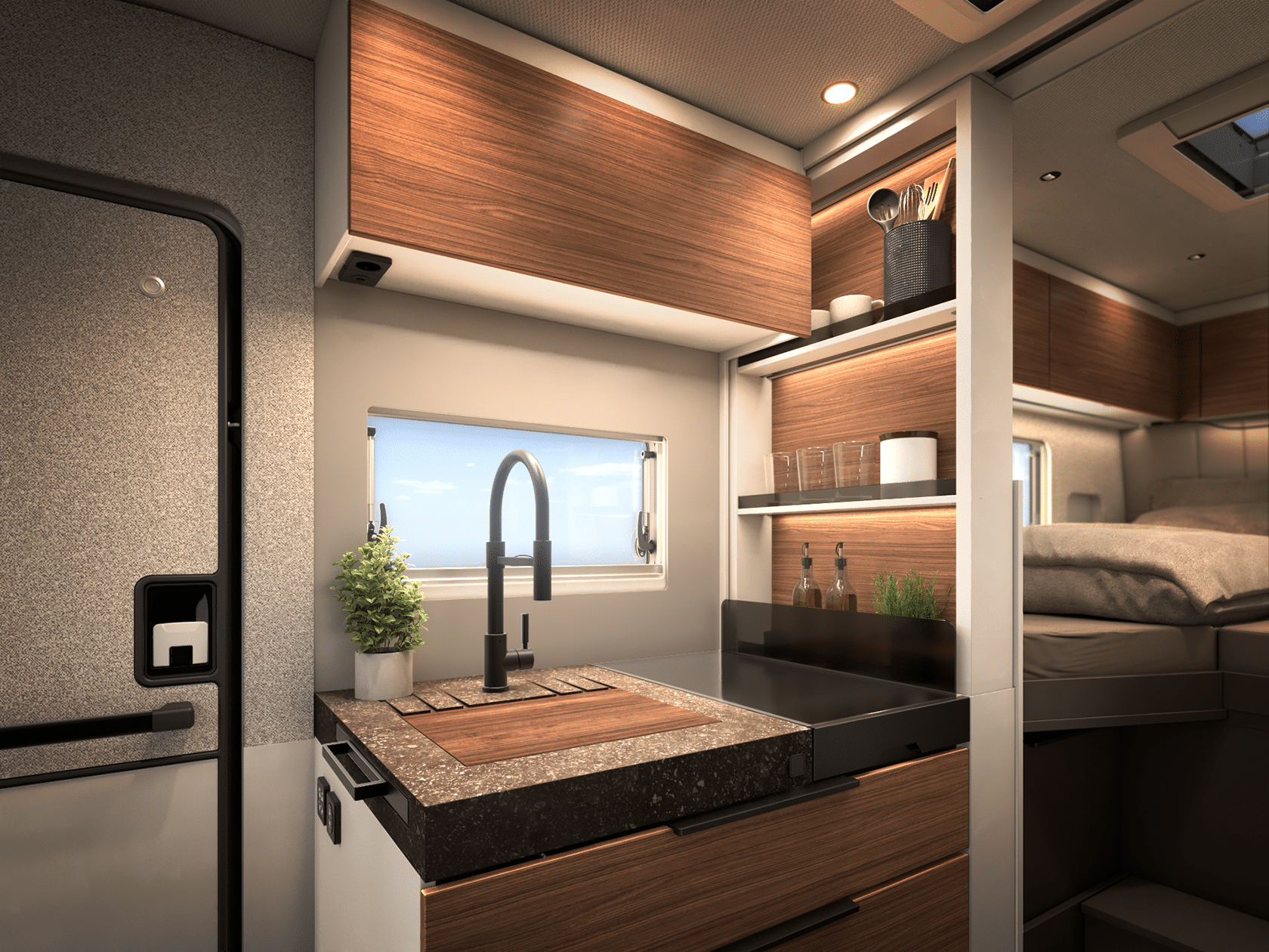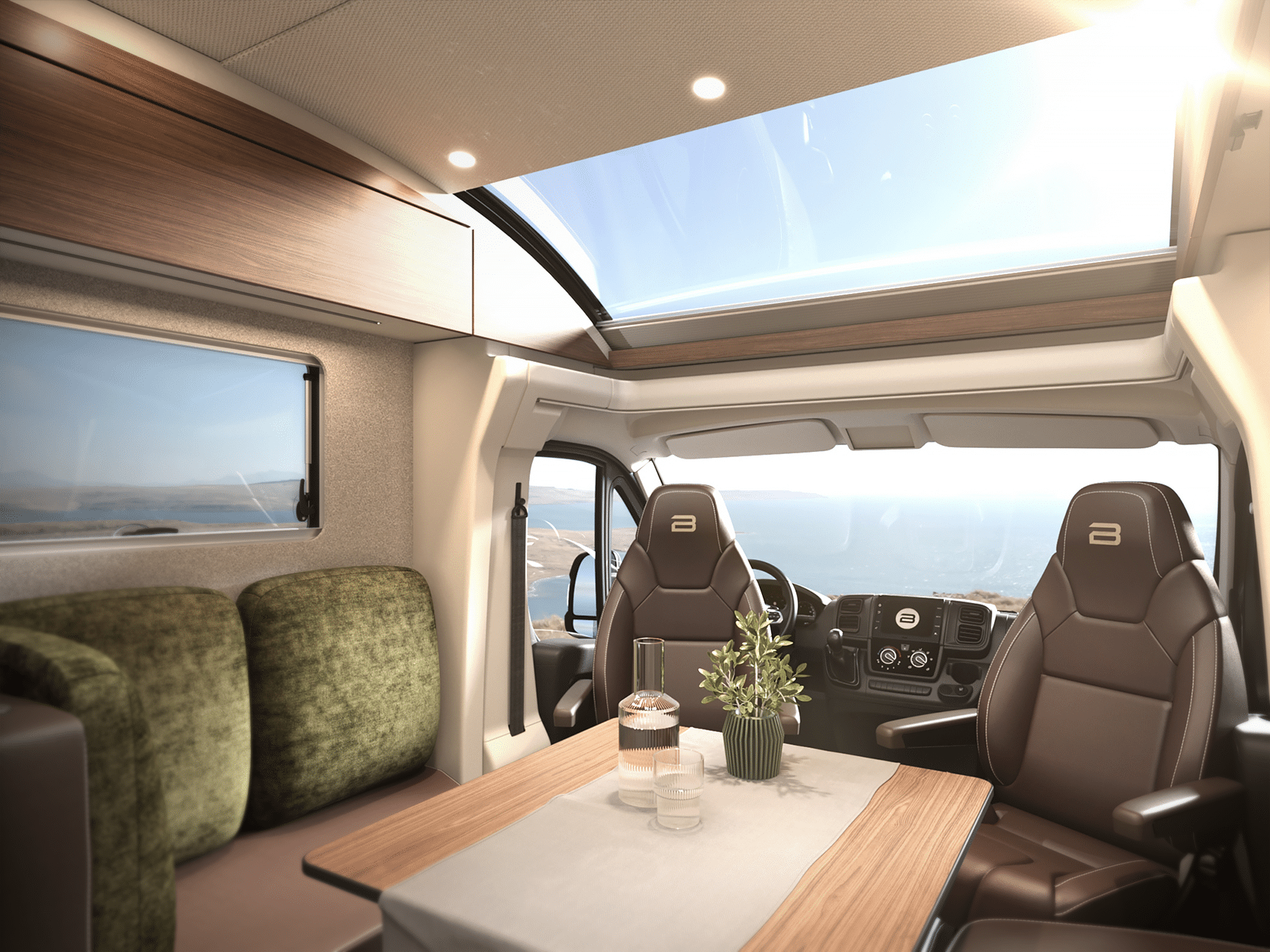 Der Bürstner Signature revolutioniert teilintegrierte Reisemobile unter 3,5 Tonnen. Auf 7,17 m Länge bietet das variable Wohnkonzept mehrere patentierte Innovationen: Eine drehbare Lounge-Sitzgruppe verwandelt sich mit einem Handgriff von einem sicheren Sitzplatz zur komfortablen Couch. Die verschiebbare Duschwand sorgt dafür, dass Waschbecken und Toilette Platz für eine große Dusche machen, ohne Wohnfläche zu verlieren. Neues Interior-Design-Konzept: Durch den im unteren Bereich integrierten Kühlschrank entsteht eine außergewöhnlich freie Sichtachse. Zusätzlich schafft das Panoramafenster eine helle und freundliche Lichtstimmung im Wohnbereich. 768 Kombinationen aus Designelementen bieten den Kunden vielfältige Möglichkeiten zur Personalisierung, darunter Polsterstoffe, Holzdekore und Korpusfarben. Das Außendesign besticht durch ein Voll-GFK-Heck mit LED-Bridge-Light und zahlreiche Individualisierungsmöglichkeiten. Attribute, die sonst nur in der Liner-Klasse zu finden sind.