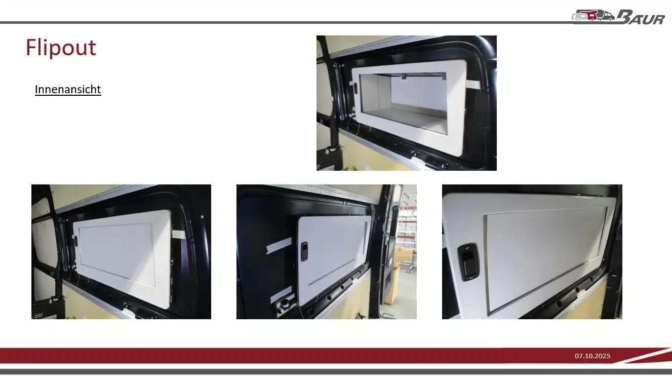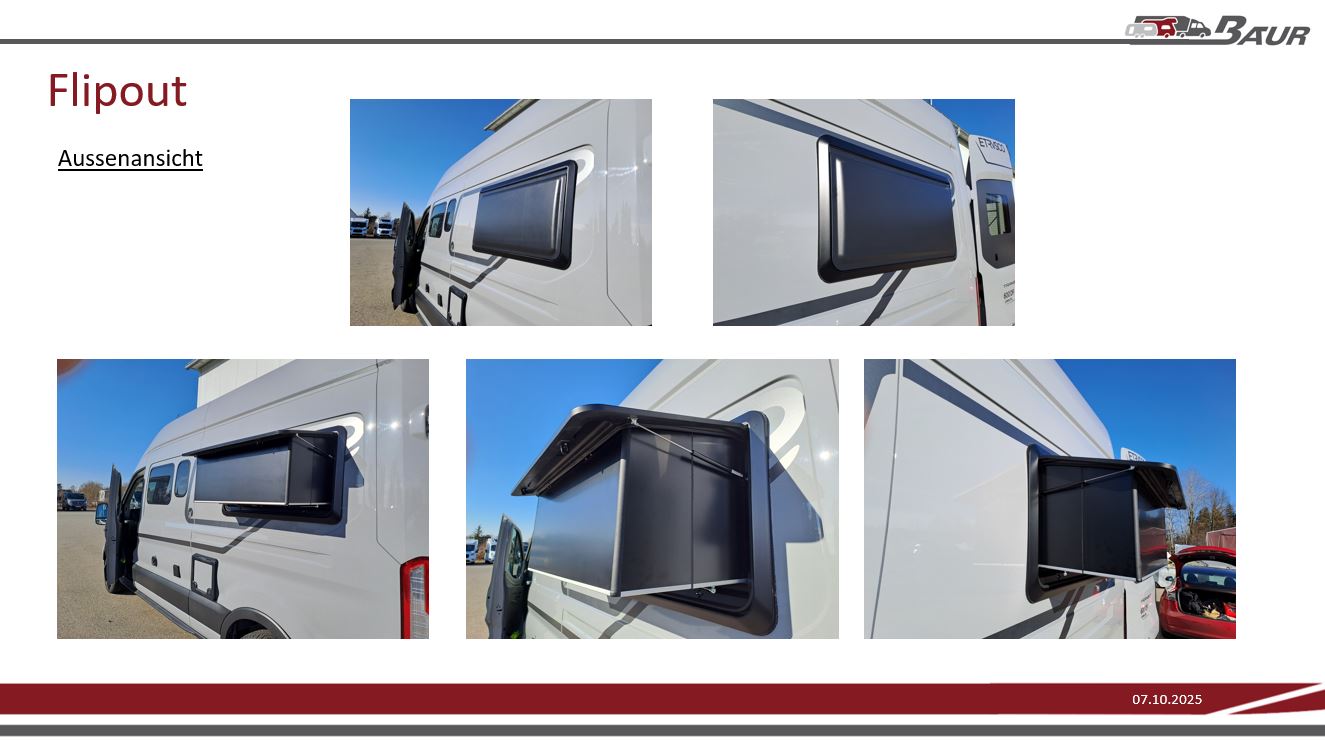 Das Flipout ist ein innovatives Raumerweiterungsmodul für Kastenwägen und Camper Vans, das es ermöglicht, insbesondere das Heckbett um ca. 42 cm zu verlängern – ideal für größere Personen. Es basiert auf einer einzigartigen Falttechnik und funktioniert komplett ohne Elektrik. Der Aufbau erfolgt manuell mit wenigen Handgriffen, unterstützt durch Gasfedern. Das System ist wärmeisolierend, wetterfest, vandalismussicher und wiegt nur ca. 15 kg. Es besteht aus einem PU-geschäumten Sandwichmaterial und ragt im geschlossenen Zustand nicht in den Innenraum hinein. Das Flipout benötigt keine Zusatzstützen und wird vollständig vormontiert (wie ein Fenster) eingesetzt und kann ohne größeres Fachwissen eingebaut werden. Das Produkt wird vollständig in Deutschland gefertigt und ist auf hohe Stückzahlen und internationale Märkte ausgelegt.