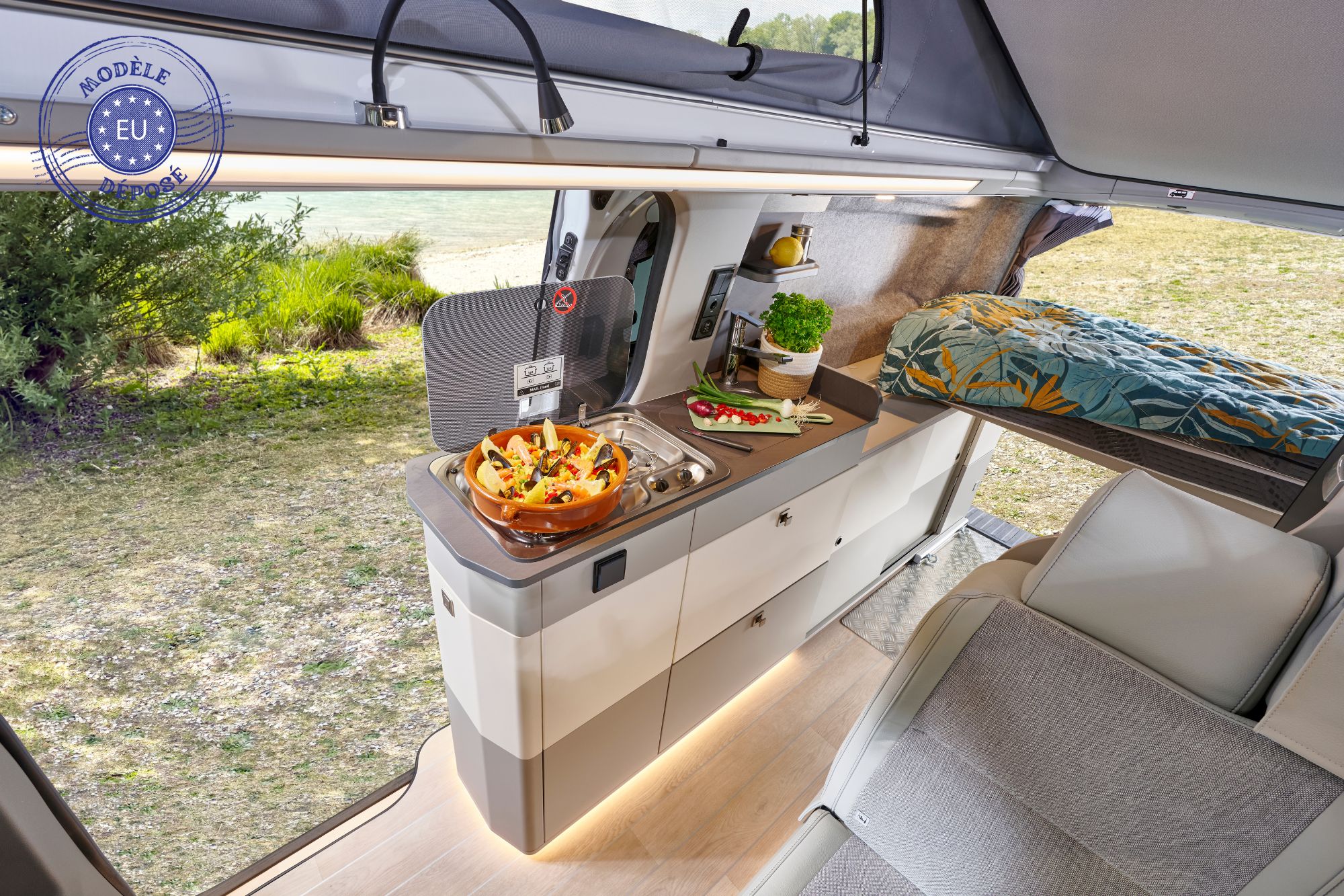 Durch seitliche Erweiterungen in den Fahrzeugfenstern, Der Westfalia Kipling zeichnet sich durch sein festes, modulares Querbett aus, das sich herausnehmen oder umklappen lässt und damit den Zugang zu einem XXL-Stauraum freigibt. Dieser bietet Platz für Freizeit- und Outdoor-Ausrüstung jeder Art.
