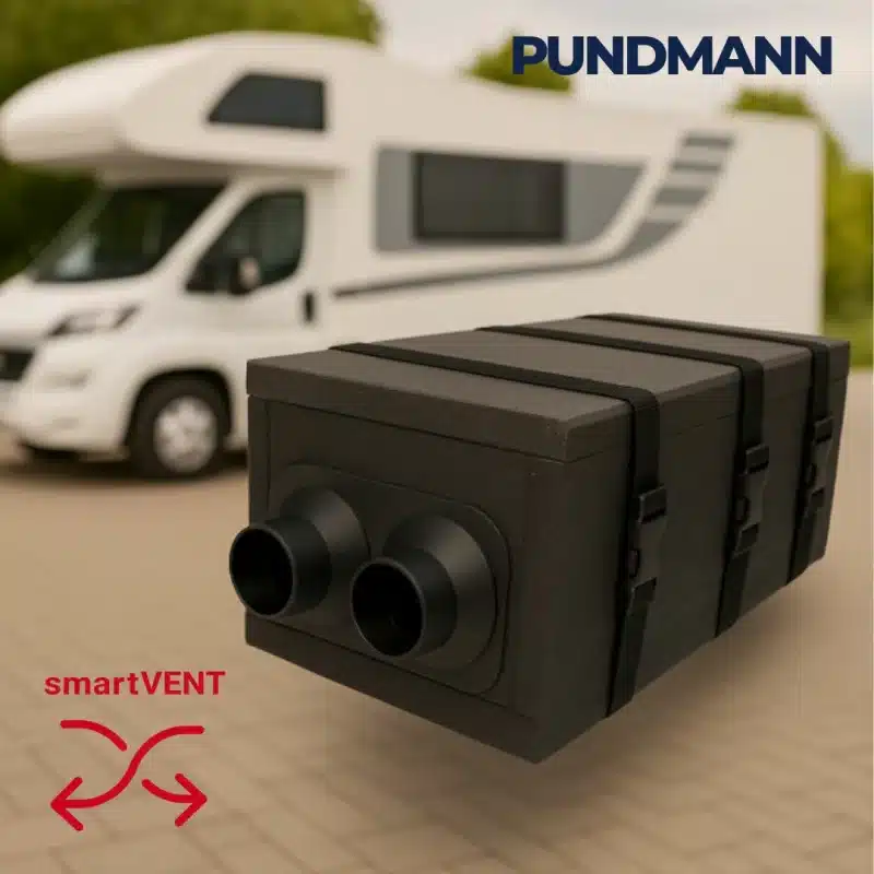 PUNDMANN smartVENT ist ein kompaktes, intelligentes Lüftungssystem mit Wärmerückgewinnung für Camper und kleine Räume. Es sorgt kontinuierlich für Frischluft, ohne Wärmeverluste – mit bis zu 92 % Effizienz. Durch permanente Überwachung von Temperatur und Feuchtigkeit verringert bzw. verhindert smartVENT Kondensation, Schimmel und schlechte Luft. Filter reinigen die einströmende Luft von Staub und Pollen, während Sensoren den Betrieb energieoptimiert regeln. Das System integriert sich unauffällig in jedes Fahrzeug und steigert Komfort, Energieeffizienz und Wohngesundheit – für ein dauerhaft angenehmes Raumklima unterwegs.